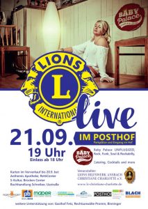Von wegen verstaubtes Damenkränzchen…Der Lions Club Ansbach Christiane Charlotte e. V. und sein Hilfswerk freuen sich auf eine coole Party im Ansbacher Posthof. Am 21. September ab 19 Uhr wird es lounge-ig – mit Catering, Cocktails und mehr bei Live-Musik von Baby Palace.
