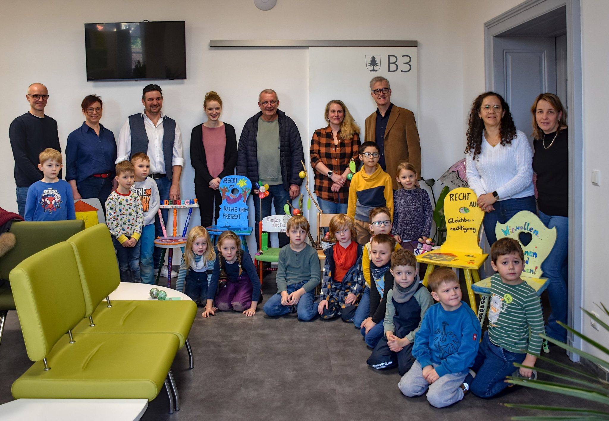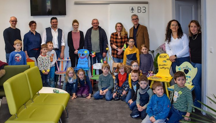 Zur offiziellen Eröffnung begrüßten Bürgermeister Patrick Ruh, Stadtrat und Jugendreferent Thomas Heidecker sowie Stadtjugendpfleger Thomas Hartnagel die Vertreterinnen und Vertreter der beteiligten Einrichtungen. Mit dabei waren auch Kinder der Kita Schwalbennest. Sie haben insgesamt drei Stühle gestaltet – zwei davon sind nun im BürgerAmt ausgestellt.