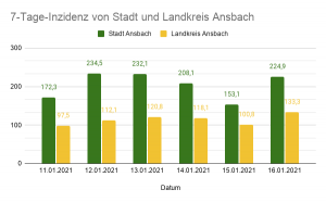Der 7-Tages-Inzidenzwert für den Landkreis Ansbach liegt bei 133,3. In der Stadt Ansbach liegt er bei 224,9 und überschreitet somit die Schwelle von 200! (Beide Werte laut RKI Stand vom 16.01.2021, 00:00 Uhr)