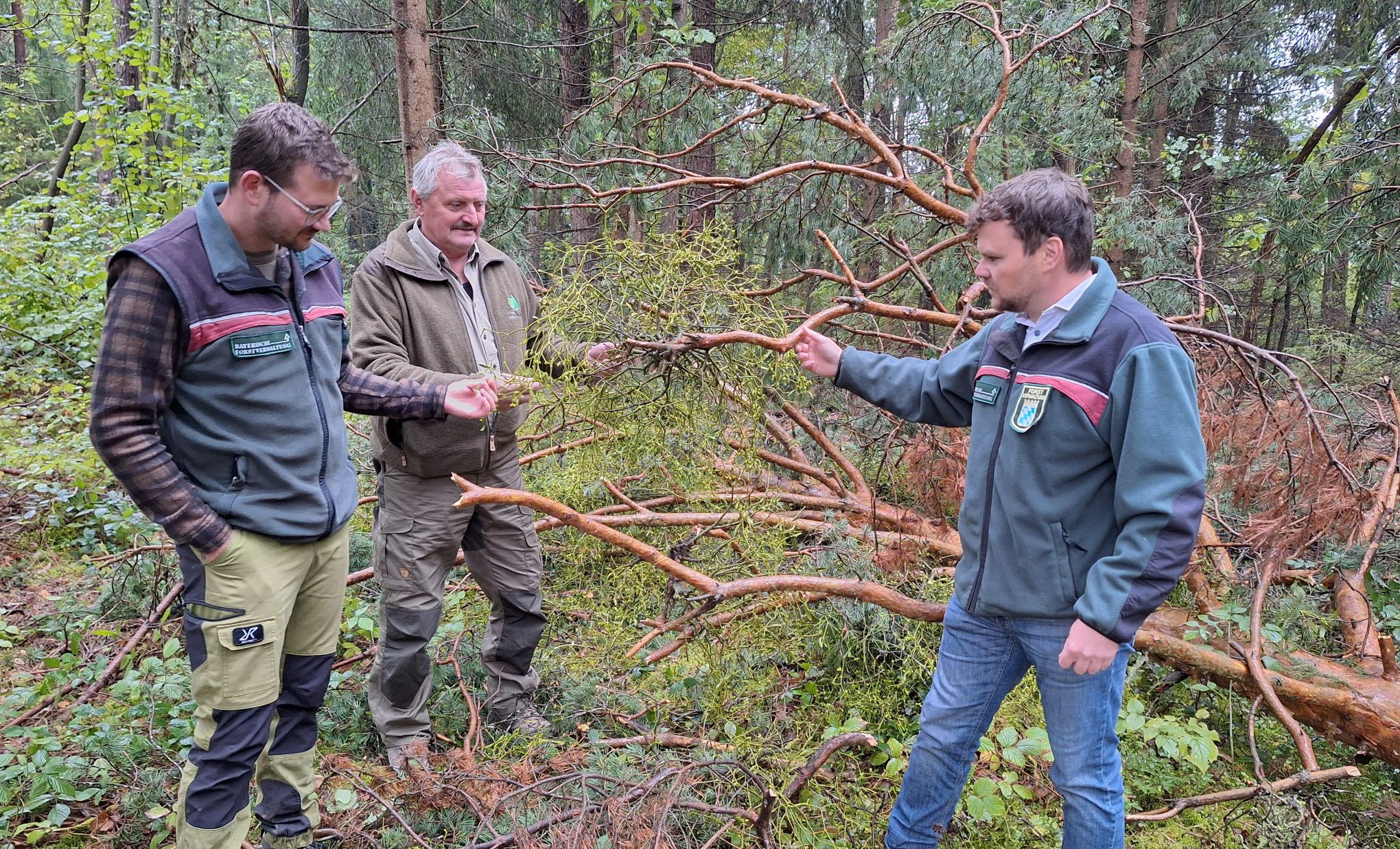 Dabei müsste neben der Fichte auch vermehrt die Kiefer in den Fokus genommen werden, erläutern der Vorsitzende der FBG Anbach-Fürth, Herbert Hechtel, und der Bereichsleiter Forsten am AELF Ansbach, Andreas Egl, bei einem gemeinsamen Ortstermin im Wald bei Weihenzell. Während die Fichte bereits seit den Stürmen Vivien und Wiebke Anfang 1990 und den nachfolgenden Borkenkäfer-Massenvermehrungen stark unter Druck steht, ist die Entwicklung bei der Kiefer relativ neu. Infolge der Hitzeextreme im Jahr 2003 und der wiederholten Hitzesommer im letzten Jahrzehnt sterben immer mehr Kiefern ab, so die Waldexperten. Erst bekämen einzelne Kiefern rote Nadeln, später sterbe nicht selten der ganze Bestand ab. Ursachen seien das Diplodia-Triebsterben – eine Pilzerkrankung, Insekten wie die Prachtkäfer, deren Larven im Bast unter der Rinde fressen und so die Leitungsbahnen für den Nährstofftransport kappen sowie ein starker Mistelbefall. Die durch die Hitze geschwächten Kiefern sind besonders anfällig gegenüber diesen Schadorgansimen.