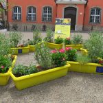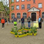 Die Gartenerlebnis-Gästeführerin Claudia Wäger war die Vorbereiterin und stellte den Kontakt zu dem Künstlerpaar her. Georg Engelhardt von der Baumschule in Weidelbach bepflanzte die Kästen mit bienenfreundlichen Pflanzen wie z.B. Schmetterlingsstrauch, Verbene, Salbei, Nelke und Rosengeranie – alles ungefüllte Blüten für Bienen.