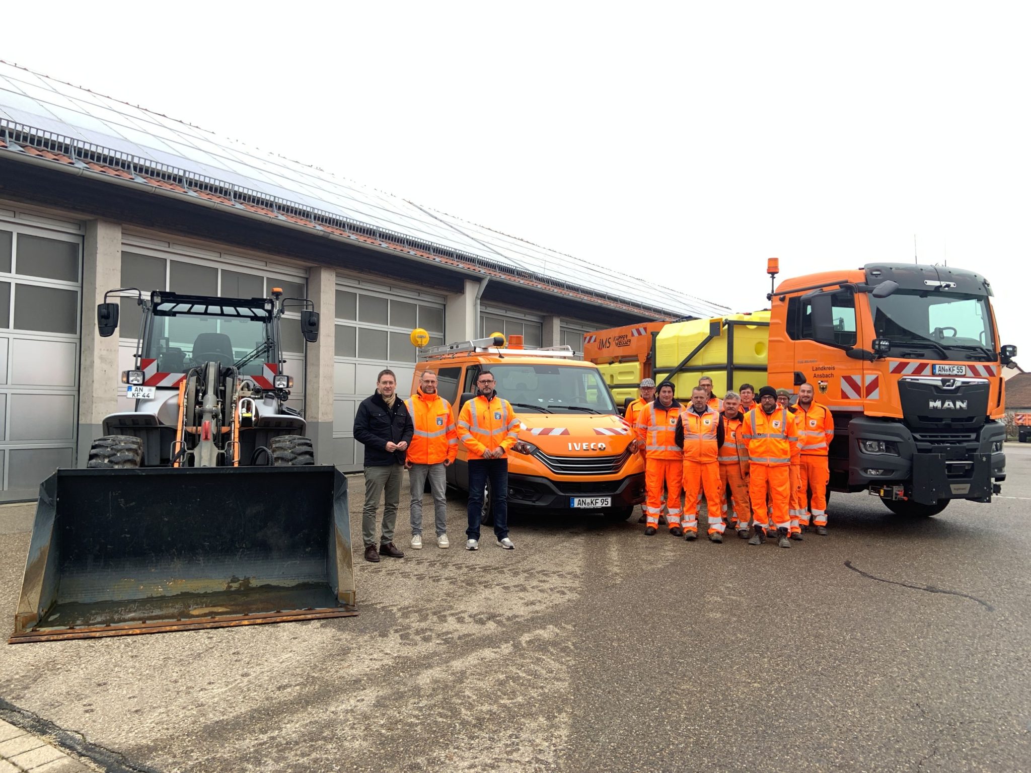 Das neue Fahrzeug ersetzt einen alten Lkw, der bereits 14 Jahre im Dienst war und rund 240.000 Kilometer zurückgelegt hat. Der neue Lkw wurde speziell für die Anforderungen der Straßenmeisterei Feuchtwangen ausgestattet, mit einem Dreiseitenkipper, einem Ladekran, einer Hydraulikanlage sowie einem Wechselsystem für den schnellen Austausch von Kipper- und Streuerbrücken. Der Lkw wird sowohl im Winterdienst für Räum- und Streudienste als auch im Sommer für Materialtransporte und Baustellenbetreuung eingesetzt. Der Gesamtwert des Fahrzeugs beträgt 528.000 Euro, davon 211.000 Euro für das Fahrzeug und 317.000 Euro für den Aufbau. Bereits im Oktober 2024 erhielt die Straßenmeisterei Feuchtwangen einen neuen Transporter für den motorisierten Straßendienst für rund 55.000 Euro. Im Januar 2025 folgte ein neuer Radlader mit Gesamtkosten von rund 130.000 Euro. „Mit diesen drei neuen Fahrzeugen verbessern wir die Effizienz und Flexibilität für den täglichen Straßenbetriebsdienst enorm. So stellen wir sicher, dass die Mitarbeiterinnen und Mitarbeiter weiterhin schnell, zuverlässig und ortsnah auf verschiedene Einsatzbedarfe auf Kreisstraßen reagieren können“, betont Dr. Ludwig.