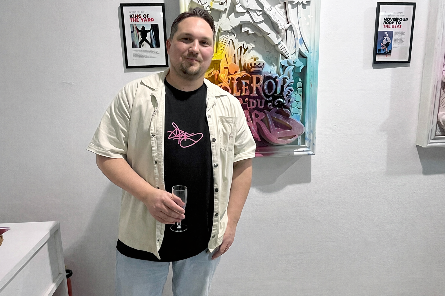 ERAS vereint mit der Ausstellung zwei für ihn prägende Welten: Die zeitlos elegante Ästhetik des Rokoko, die Holzinger durch einen Auftritt bei den Rokoko-Festspielen schon aus jungen Jahren kennt, trifft auf Graffiti. Man könnte meinen, dass sich diese Kunstform, die in den frühen 1980er-Jahren aus den USA nach Deutschland überschwappte, auf den ersten Blick nur schwer mit dem Rokoko kombinieren lässt. Doch Holzinger bewegt sich mit seinen Kunstwerken geschickt zwischen beiden Epochen. „Die Leute haben mich immer gefragt, was ich eigentlich mache, und dann ist mir gekommen, dass das eigentlich auch Reliefs sind“, erzählt er. Das Zusammenspiel aus Relief und Graffiti findet sich deshalb auch im Namen der Ausstellung wieder: „ReliGraff“. Neben ERAS präsentieren auch die befreundeten Künstler YARD und Khan eine Auswahl ihrer Arbeiten. Eröffnet wurde der Abend mit einer Darbietung der Rokoko-Tanzgruppe des Heimatvereins.