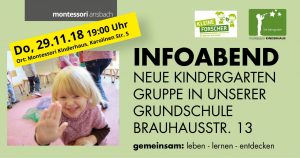Aus diesem Grund laden wir alle interssierten Eltern herzlich zu unserem 1. Infoabend am 29.11.2018 um 19:00 Uhr in unser Montessori-Kinderhaus in der Karolinenstraße 5 ein.