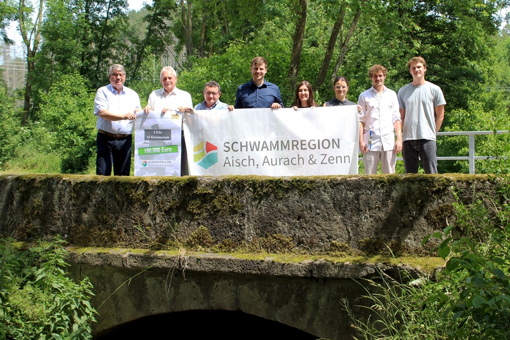 Das zerstörte Brückengeländer ist mittlerweile erneuert und das Wetter meinte es mit den Verantwortlichen beim offiziellen Pressetermin gut. 180.000 Euro gibt es vom Amt für Ländliche Entwicklung Mittelfranken als Förderung für ein Büro, das die Schwammregion „Aisch, Aurach & Zenn“ fachlich begleitet. Die Schwammregion ist die einzige in Mittelfranken.