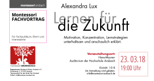 Der Montessori-Verein Ansbach e.V. lädt Fachpublikum, Eltern und Interessierte zu einem Fachvortrag der Montessori-Pädagogin Alexandra Lux zum Thema: Lernen für die Zukunft-mit einer „alten“ Methode wie Montessori? ein. Die Referentin erläutert unterhaltsam und anschaulich wie verschiedene Lernstrategien, Motivation und Konzentration in der Montessori-Pädagogik gelebt werden.