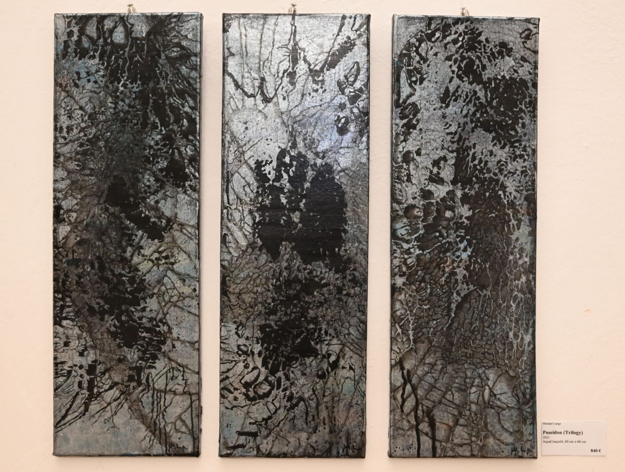 Dabei werden zwei wesentliche Aspekte vereint: Wasser, das eine entscheidende Rolle im künstlerischen Prozess spielt, während Craquelé an die entstandenen feinen Risse oder Strukturen erinnert. Durch die unterschiedlichen Schichten bleiben die Farben eher „im Dunkeln“. Es entstehen besondere Effekte, die von den jeweiligen Lichtverhältnissen im Raum und Betrachtungswinkeln abhängig sind.