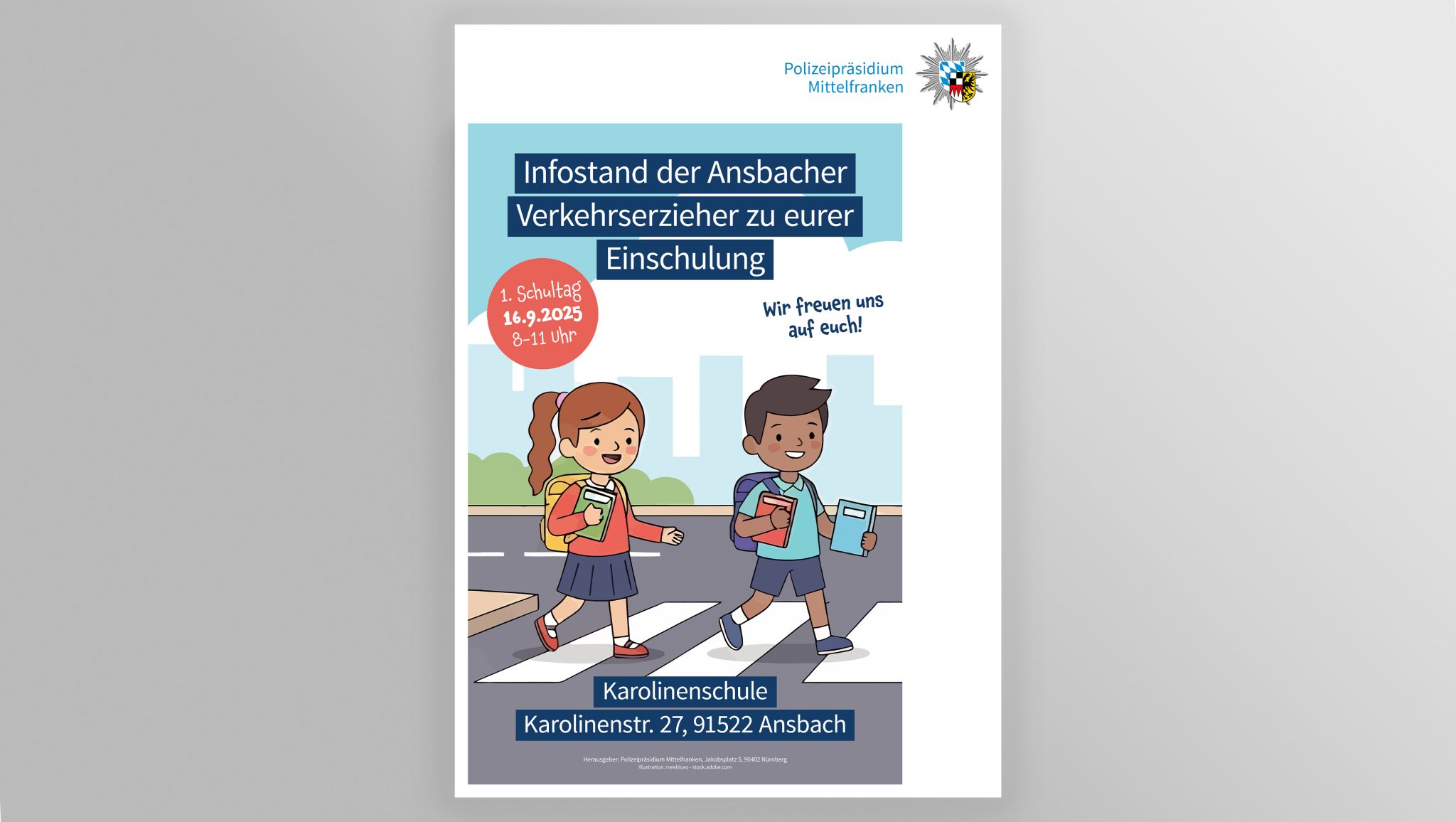 Die Sommerferien neigen sich dem Ende und damit steht der Start ins neue Schuljahr unmittelbar bevor. Auch für viele Schülerinnen und Schüler in Mittelfranken beginnt ab Dienstag (16. September 2025) der Ernst des Lebens. Vor einer Grundschule in Ansbach erklärt die Polizei an einem Infostand, wie wichtig die Schulwegsicherheit gerade für die Jüngsten unter uns ist.