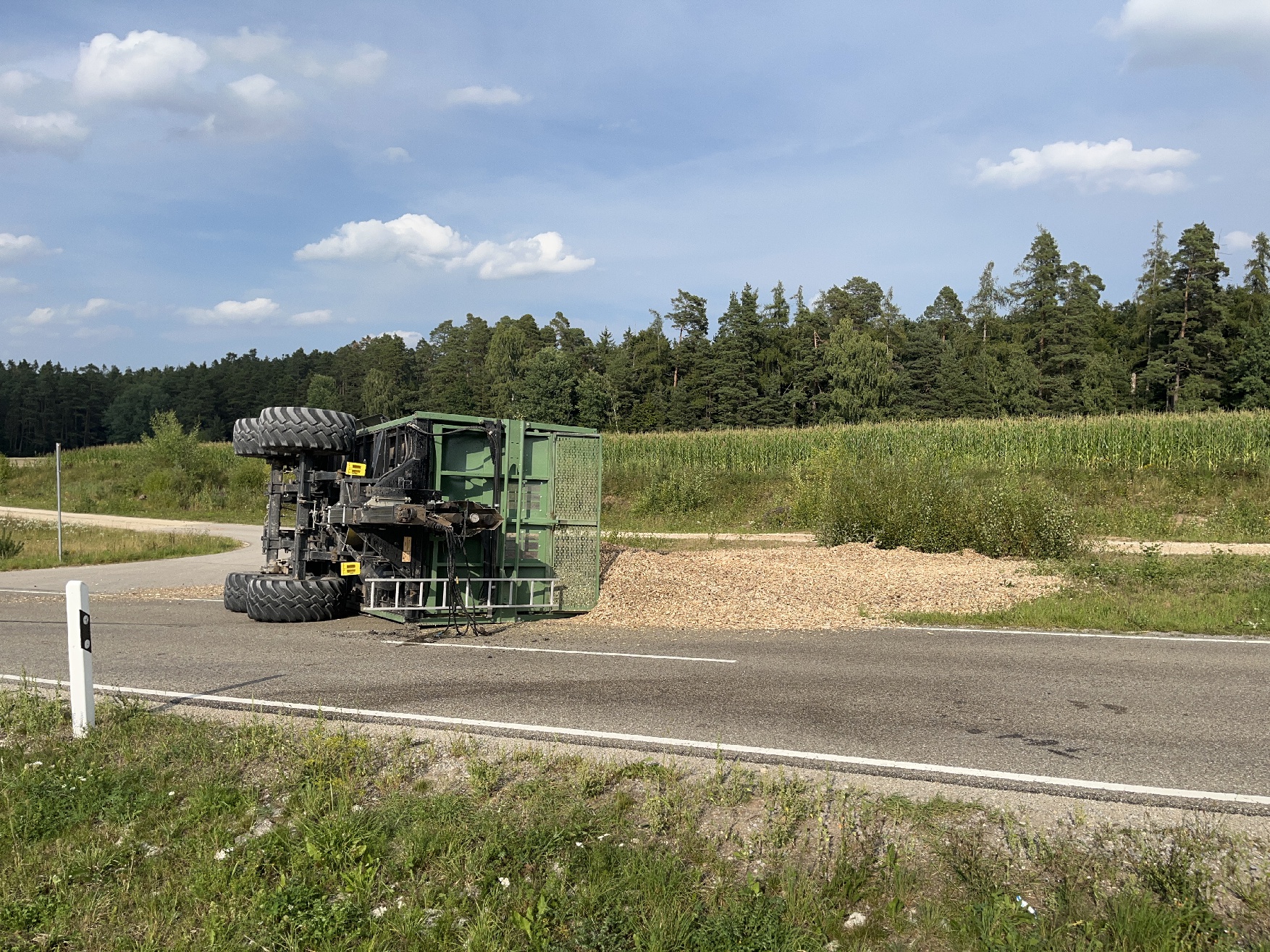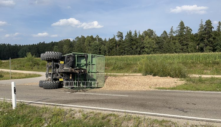Am Samstag, 16. August 2025, gegen 17:25 Uhr, fuhr ein 18-Jähriger mit einem Traktor samt Anhänger von einem Flurbereinigungsweg in die Staatsstraße 2412 ein. Auf Grund von nicht angepasster Geschwindigkeit kippte der Anhänger bei der Kurvenfahrt um und verlor ca. 30 m³ Hackschnitzelladung. Diese und auslaufende Betriebsflüssigkeiten verteilten sich auf der Fahrbahn, weshalb die Feuerwehr und auch die Straßenmeister vor Ort kamen.
