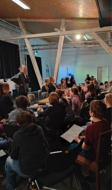 Am Dienstag, dem 21.10., trafen die Schülerinnen und Schüler zum ersten Mal auf die Kunstschaffenden und durften miteinander ins Gespräch kommen. In gemütlicher Runde standen die Schauspieler Otto Beckmann, Margherita Campostrini, Nicole Schneider und Sophie Weikert den jungen Besuchern Rede und Antwort und ließen sie an der ersten Leseprobe des neuen Stückes teilhaben. Gleich zu Beginn eines neuen Probenprozesses ein so involviertes Publikum zu haben war für das Team, rund um Regisseur Frank Siebenschuh, in gleicherweise ungewohnt wie aufregend und hat auf beiden Seiten bleibenden Eindruck hinterlassen. Besonderes Highlight für alle Beteiligten war die Vorstellung des geplanten Bühnenbilds und der Kostüme durch Tame Priwitzer.