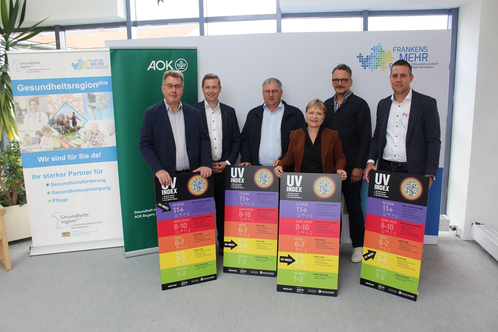 Neustadt a.d.Aisch, 5. August 2025 – Die Arbeitsgemeinschaft Dermatologische Prävention (ADP) und die Deutsche Krebshilfe entwarfen gemeinsam UV-Index-Tafeln, welche nun die AOK Bayern an Vertreterinnen und Vertretern der Gemeinden im Landkreis Neustadt a.d.Aisch-Bad Windsheim übergab.