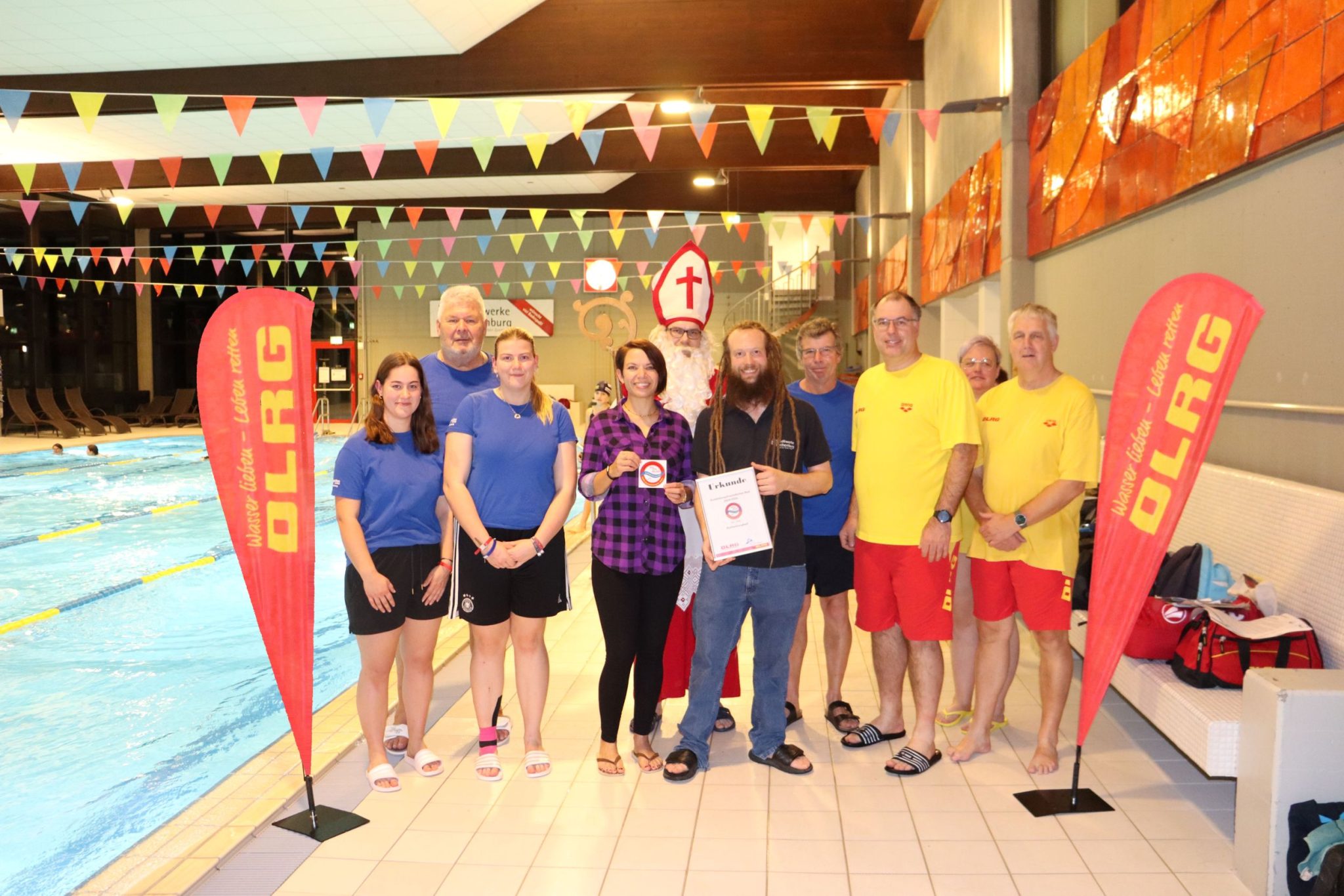 Die Übergabe der Auszeichnung fand am Montagabend während des Übungsbetriebs der DLRG Niederstetten statt und sorgte für eine ganz besondere Überraschung: Der Nikolaus kam ins Hallenbad! Bei fröhlichen Klängen von den Kindern überreichte der Nikolaus nicht nur die Auszeichnung, sondern verteilte auch Schokoladennikoläuse an die jungen Schwimmerinnen und Schwimmer.