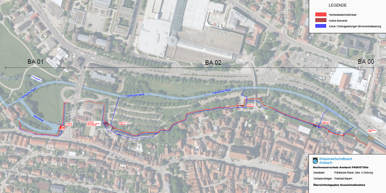 Für den Hochwasserschutz werden zwischen der Voggenmühle und der Residenz Hochwasserschutzwände mit einer Gesamtlänge von ca. 1.015 m errichtet. Nach Fertigstellung des Hochwasserschutzes wird eine Fläche von ca. 9 ha mit etwa 200 Gebäuden und rund 1.100 Einwohner vor Hochwasser geschützt. Die Bemessung der Hochwasserschutzanlagen erfolgt auf das hundertjährliche Hochwasserereignis, wobei zusätzlich ein Klimazuschlag in Höhe von 15% berücksichtigt wird. Die Hochwasserschutzanlagen schützen später die Ansbacher Altstadt vor einem Hochwasserabfluss der Fränkischen Rezat von bis zu rund 95 m³/s.