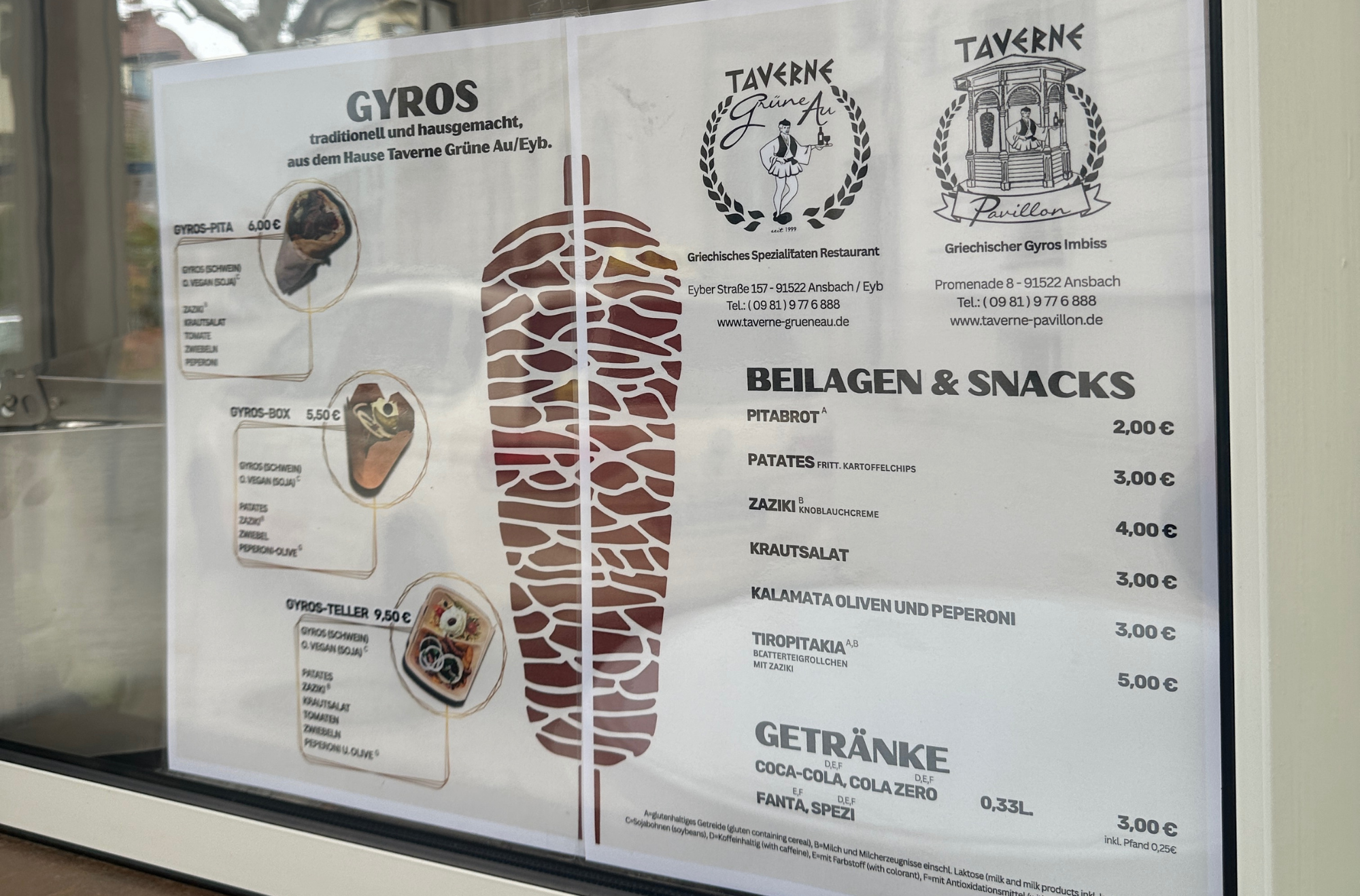 Auf der Karte stehen Klassiker der griechischen Küche: Gyros Pita, Gyros Box und Gyros Teller, dazu köstliche Beilagen und Snacks wie Pitabrot, Zaziki, Krautsalat, Kalamata-Oliven, Peperoni und Tiropitakia. Erfrischende Getränke runden das Angebot ab.