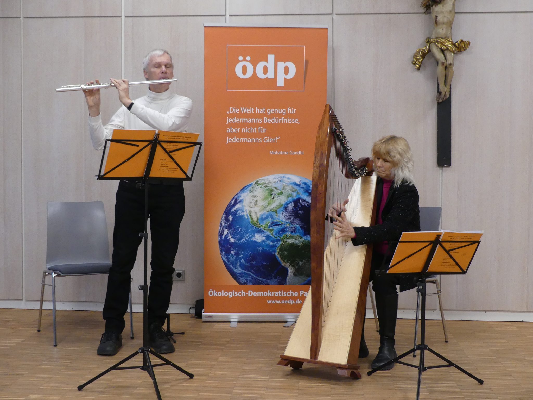 Das kulturelle Rahmenprogramm des Empfangs gestaltete das Duo Cadore. Gabrielle Weigel und Stephan Iglisch verzauberten mit ihren Flöten- und Harfenklängen und führten in die Entstehung der jeweiligen Musikstücke mit ihrem vielseitigen Wissen ein.
