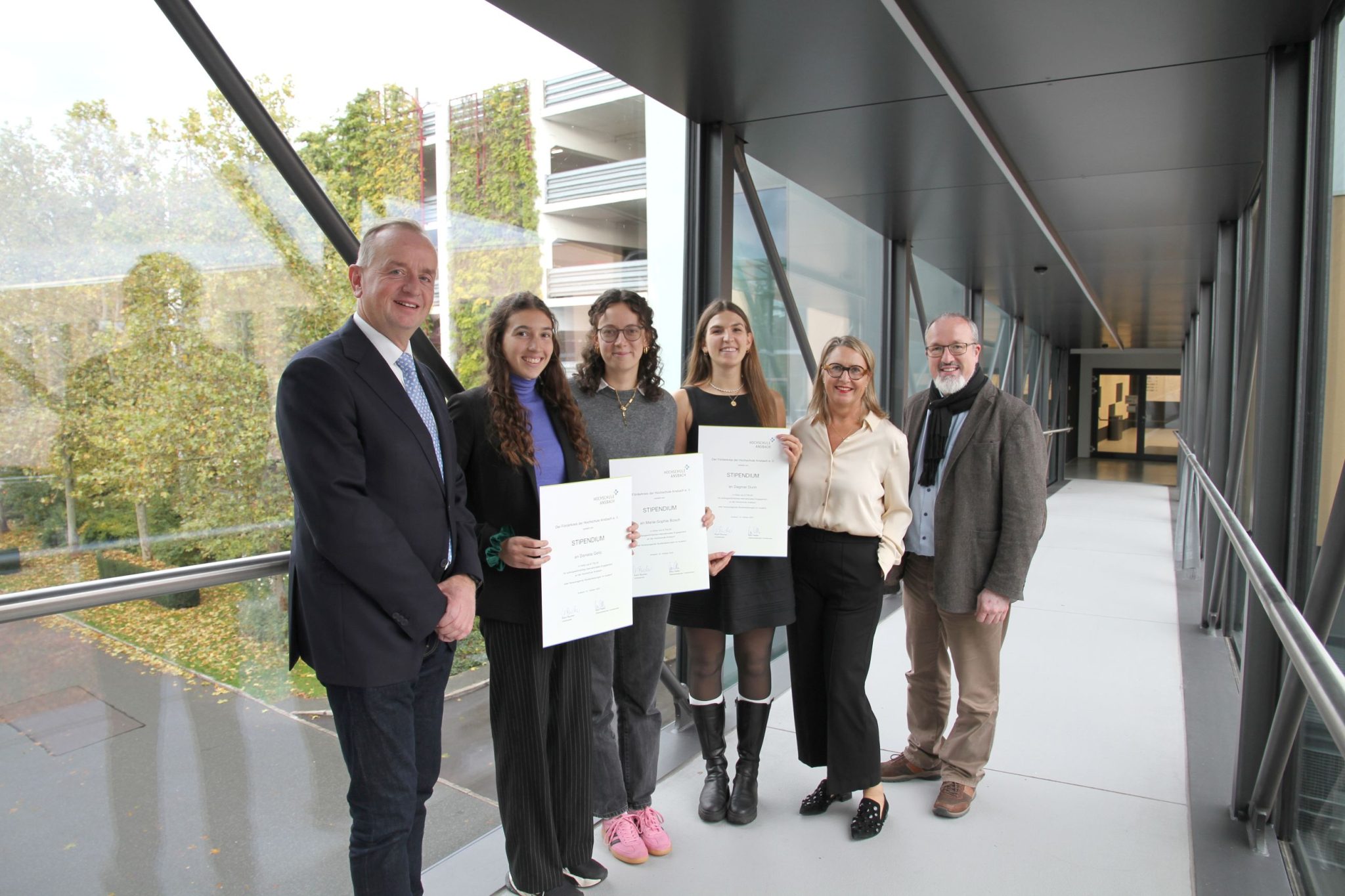 Überreicht wurden die Stipendien von Karin Bucher (Vorsitzende des Förderkreises der Hochschule Ansbach e. V.), Thomas Deffner (Oberbürgermeister der Stadt Ansbach) und Prof. Dr.-Ing. Sascha Müller-Feuerstein (Präsident der Hochschule Ansbach).